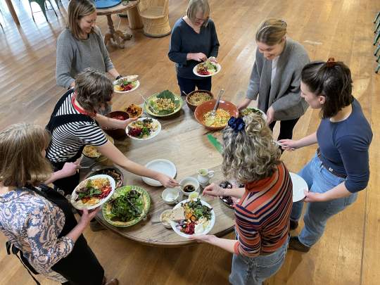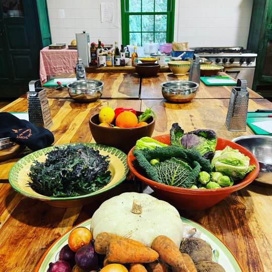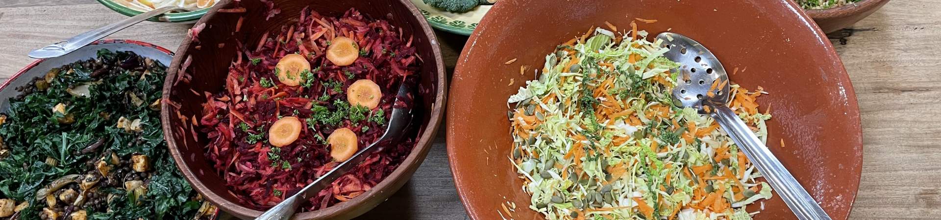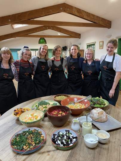 Includes a light organic lunch, enjoying the feast of salads produced during the morning.